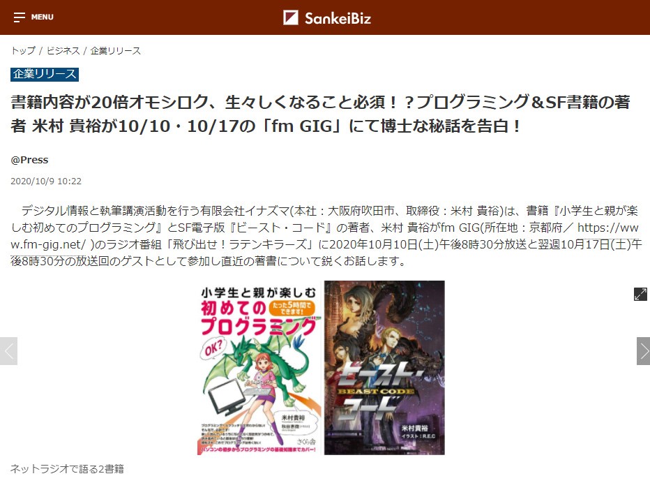 メディア掲載、インタビュー、受賞歴など、有限会社イナズマと代表・米村貴裕に関する主なパブリシティ情報をまとめています。