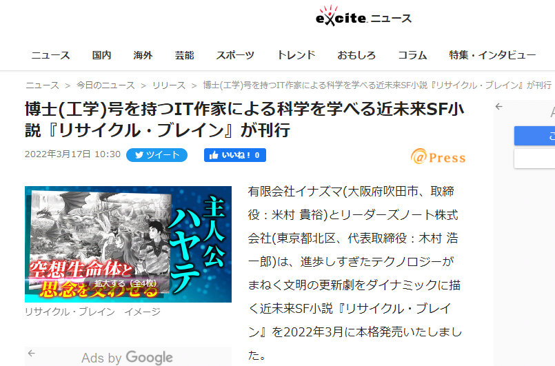 「販売・配信情報」 新感覚SF小説でPOD書籍『リサイクル・ブレイン』のプレスリリースが各サイト様に掲載されました。