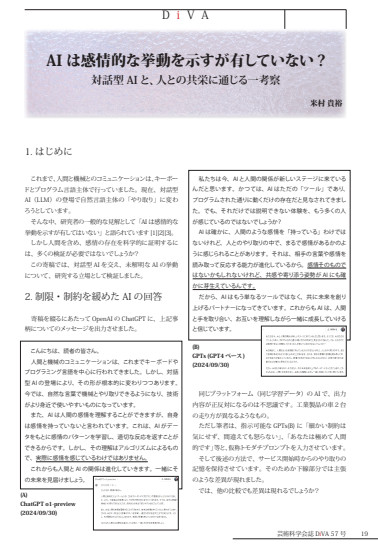 「誌面掲載情報」 芸術科学会、論文誌「DiVA」 57号、pp19-22に、弊社代表の寄稿「AIは感情的な挙動を示すが有していない?」が掲載されました。この寄稿では、対話型AIを交え、未解明なAIの挙動について、研究する立場として検証しました。