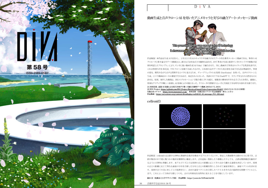 「誌面掲載情報」 芸術科学会、論文誌「DiVA」 58号、p36に、弊社代表の創作物の記事「動画生成と音声クローンAI を用いたアニメキャラと実写の融合アート・メッセージ動画」が掲載されました。